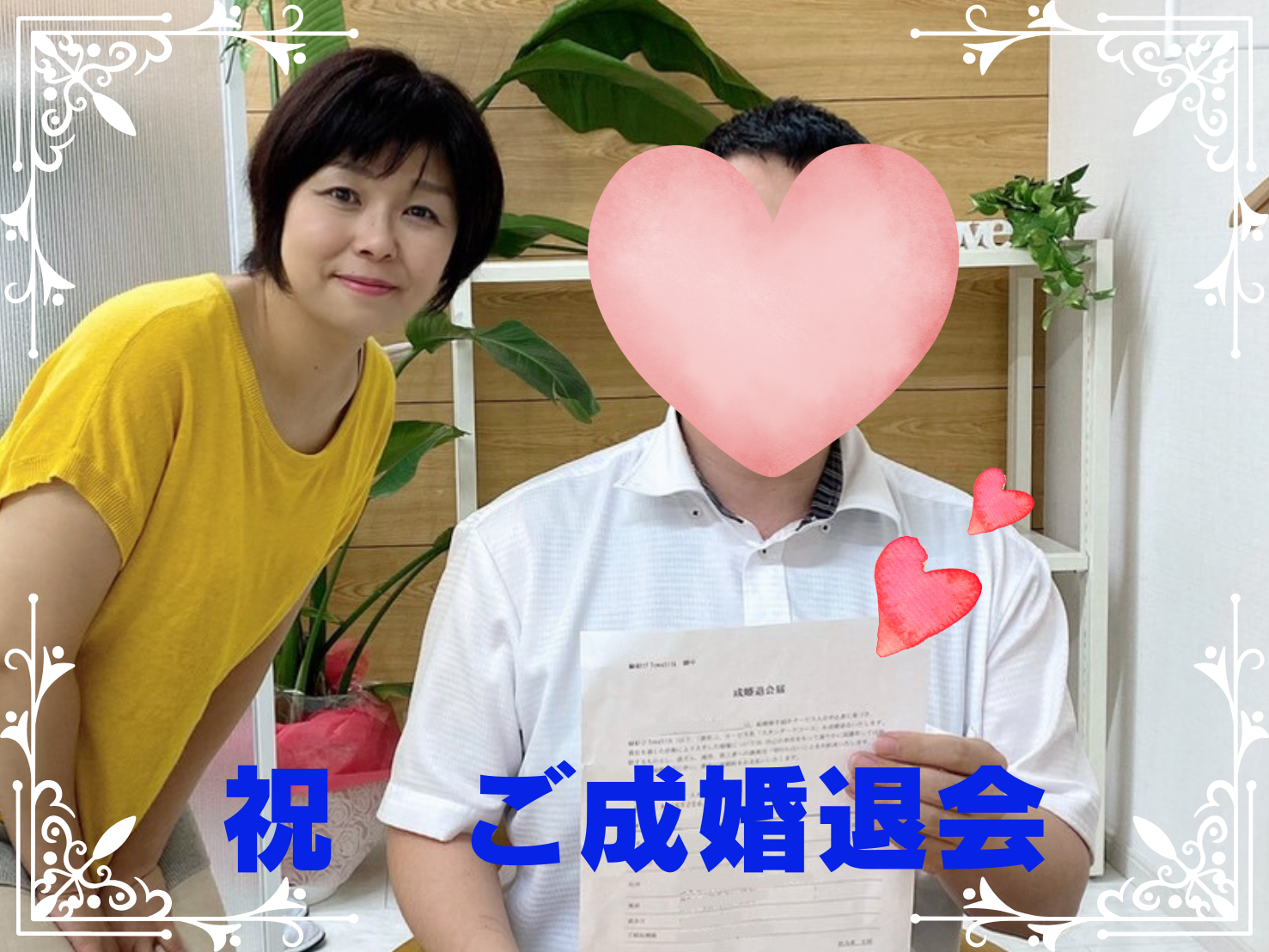 「将来、毎日を一緒に過ごせるパートナーが欲しい」という思いでご入会されました。無料面談でご説明させていただいた後、その場で「入会します!」と決断。「中村さんのお人柄が分かったので入会する決心がつきました。」と言っていただきました。必要書類や入会金も準備されており、無料面談当日に入会手続きを済ませました。