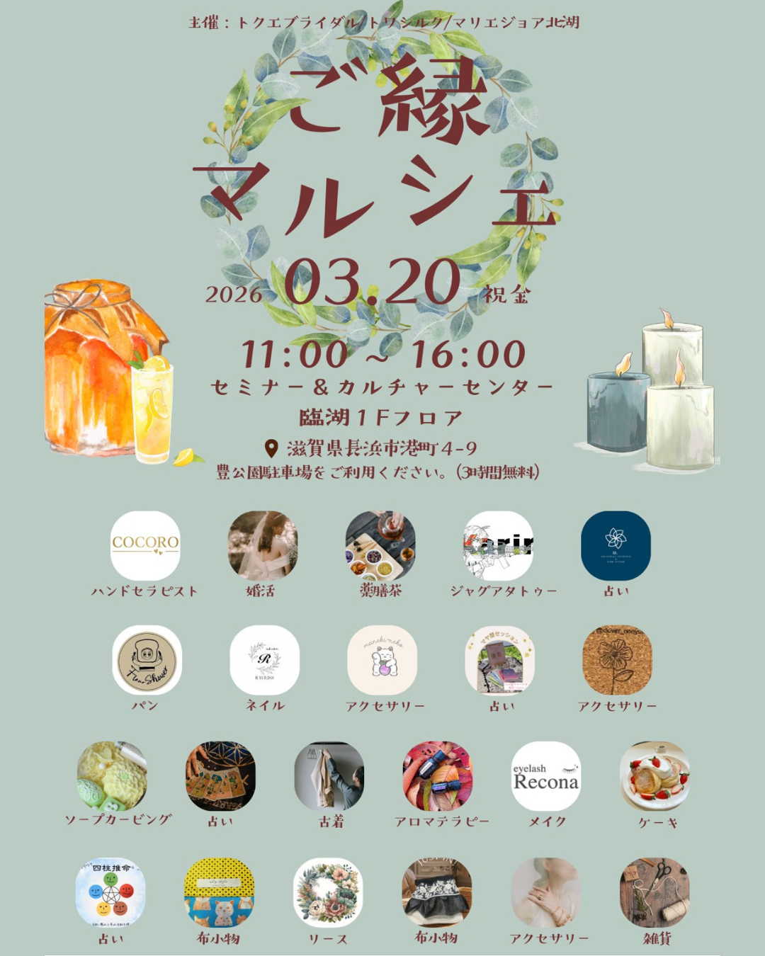 ケーキ・占い・ハンドメイドなどなどたくさんのお店が出店されます♪お友達やご家族様とたくさんのご来場をお待ちしております