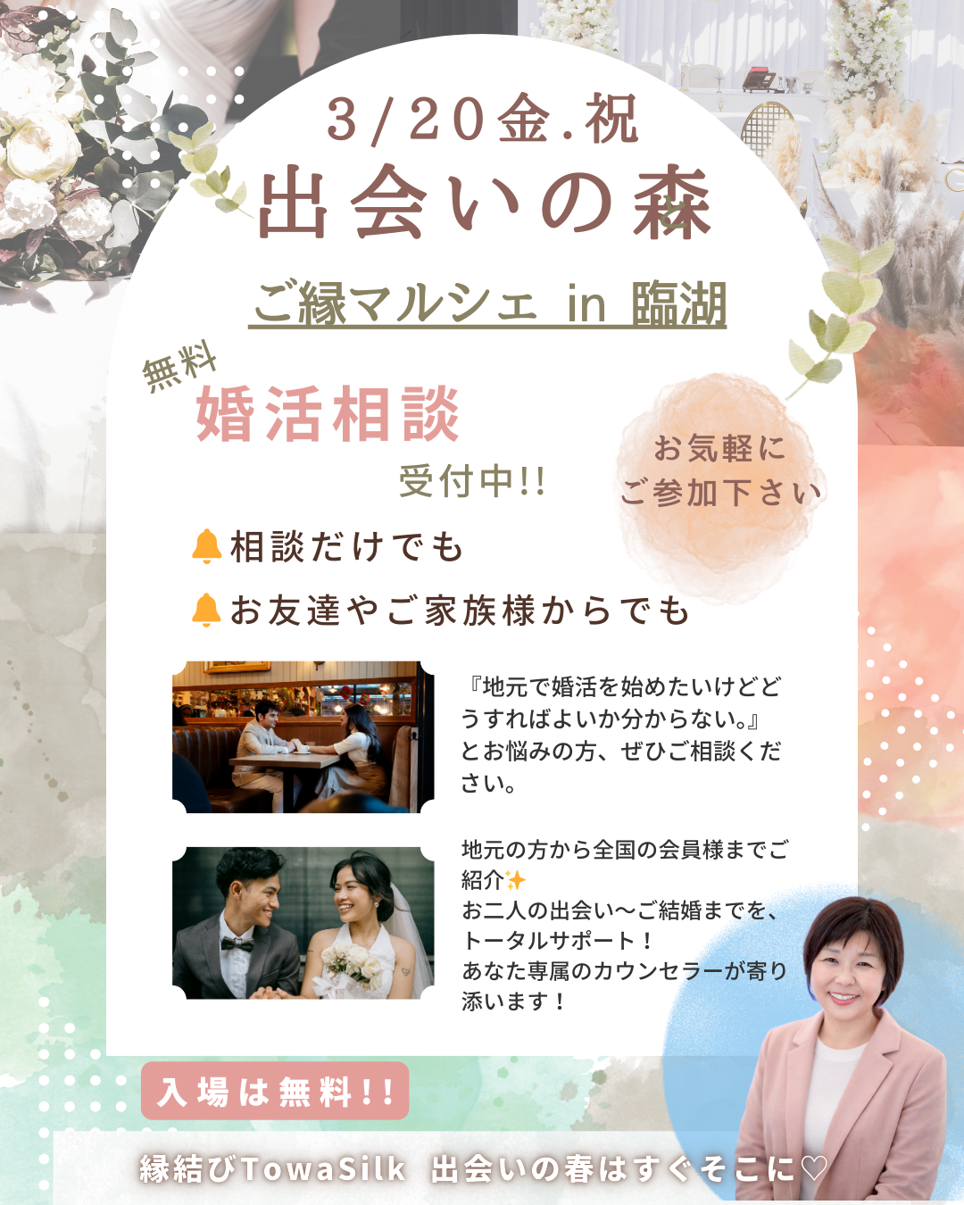 ※無料相談のお申し込みは、縁結びTowaSilk内お問い合わせリンク、お電話、公式LINEからお願いいたします。他からのお問い合わせはキャンペーンの対象となりませんのでご注意ください。